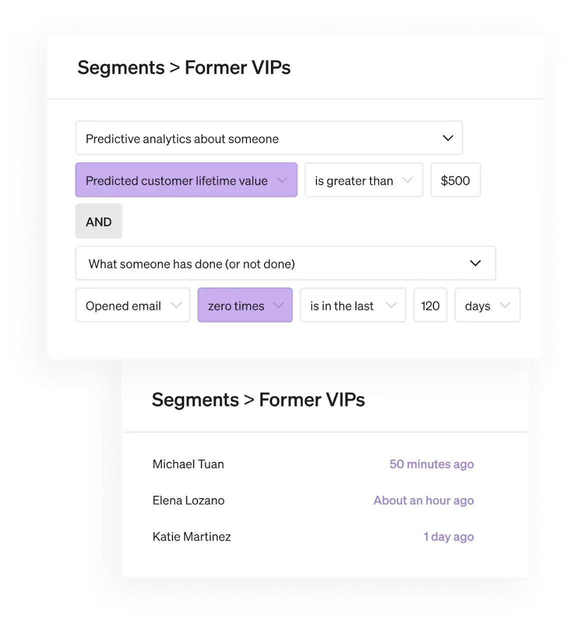 Segments are groups of people defined by a set of conditions (e.g., what they’ve done and properties about them). Unlike a list, which is a fixed group of subscribers, a segment will grow as new people meet the conditions you've set and shrink as people no longer meet them.